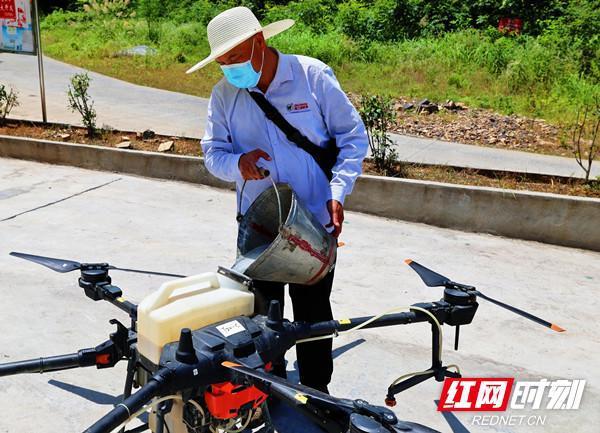 红网时刻新闻7月15日讯(通讯员 杨贵新 袁志湘 阳赤远)7月14日,在隆回县北山镇大伍村马弯山,随着药剂师调药、装药等一系列准备工作完成,机手拿着遥控器按下起飞键,一架载满生物农药的无人机腾空而起,直奔松树林上空,洒下药水。