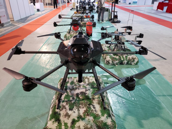 四块科技展出察打无人机、水上救援无人机、消防火箭无人机、森林消防无人机、单兵背负式无人机、特种作战飞榴无人机等精彩亮相。察打无人机可以发射40MM、35MM、38MM制式枪榴弹,发射38MM催泪弹能打出特殊的直角弹道,弹丸发射后可空中制动并垂直下落,打击建筑物背后的目标,特别适合用于城市环境使用。高层建筑消防灭火无人机,起飞重量45公斤,飞行时间20分钟,弹种是100MM消防弹,抗风等级8级。