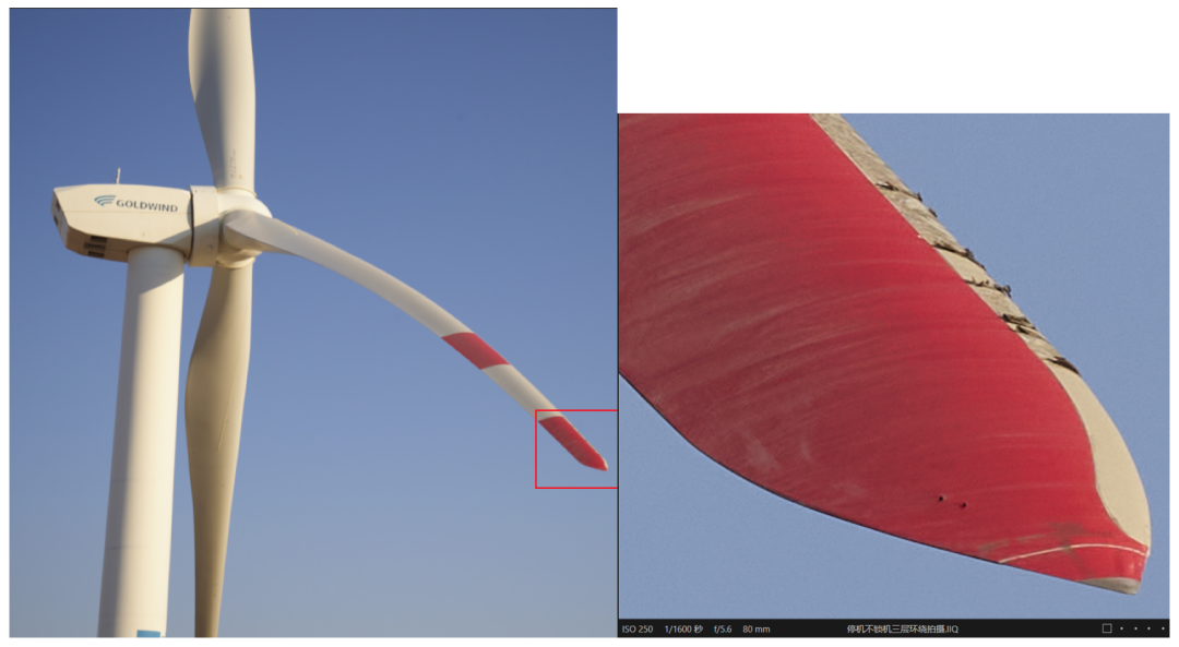 Phase One工业相机采用中画幅CMOS(感光元件),相比普通变焦相机,它的拍摄范围更广,拍摄内容更全面。1-2张照片即可实现单个叶片的覆盖拍摄。同时,高达1亿/1.2亿的相机分辨率又能保证拍摄画面的清晰度,确保图像放大后依然能清晰地展示出叶片表面磨损、凹痕等各种细节情况。
