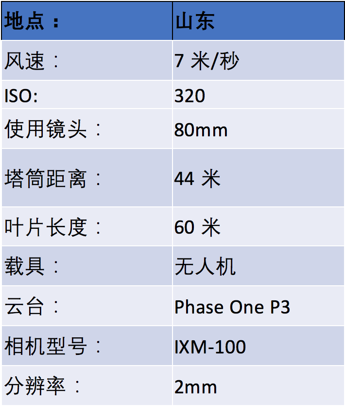 使用Phase One iXM-GS120 1.2亿像素相机搭配80mmAF、150mmAF长焦镜头,在距离风机叶片斜前方40米-80米拍摄风机叶片正前方影像,保持叶片在距离拍摄者最近的视场角内,在距离风机叶片斜后方40米-80米拍摄风机叶片正后方影像,保持叶片在距离拍摄者最近的视场角内。在风机平行方向距离40米-90米两侧拍摄叶片前、后缘。