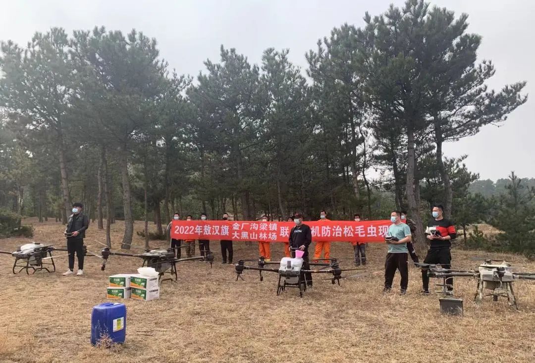 今年 4 月末,内蒙敖汉旗首次尝试用农业无人机防控油松松毛虫。由于油松树高林密,受限于地形,地面机械难以进行作业。四架大疆农业无人机,两天便完成了 4000 亩的防治任务。