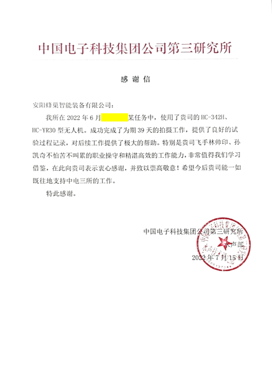 信中表示,中国电子科技集团公司第三研究所在某任务中,使用安阳蜂巢智能装备有限公HC-342H、HC-YR30型无人机,成功完成了为期39天的拍摄工作,提供了良好的试验过程记录,对后续工作提供了极大的帮助。特别是公司飞手林帅印、孙凯奇不怕苦不叫累的职业操守和精湛高效的工作能力,非常值得学习借鉴,表示衷心感谢,并致以崇高敬意,希望今后蜂巢能一如既往地支持中电三所的工作。