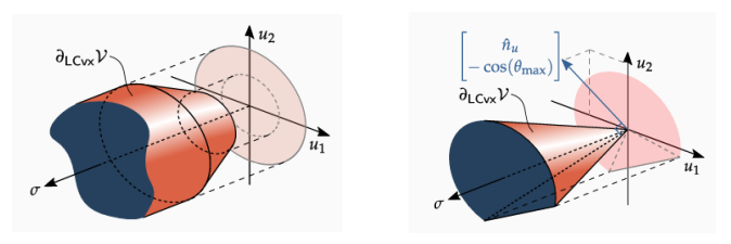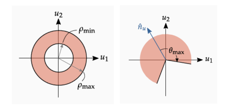 其中是人为设定的单位方向向量(比如竖直向上),而是角度的最大转动幅值。这两个约束可以分别直观地用几何表示为图1A和图1B中的红色区域(推力是二维的):
