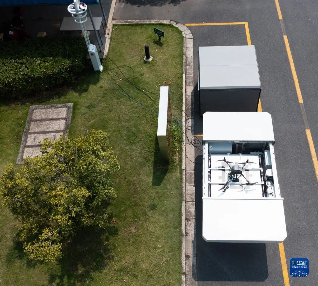 7月28日,无人机从机巢中起飞按照预先设定的线路进行巡检。