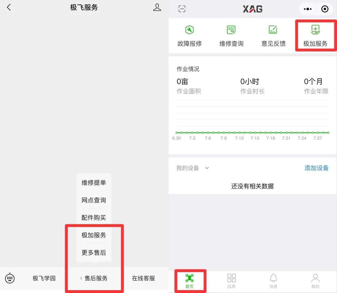 1. 极飞服务公众号-底部菜单【售后服务】-【极加服务】