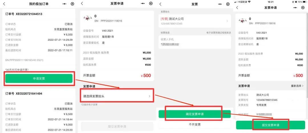 【我的极加订单】-【申请发票】-【选择发票抬头】-【确认发票申请】-【提交发票申请】