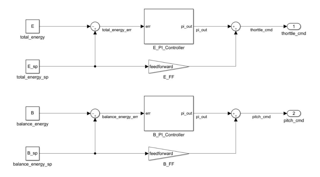 定高模式其中核心算法为TECS总能量控制,关于总能量控制的数学原理在此不做详细讲解。算法核心为将总能量误差和平衡变化率误差采用pi控制,总能量和平衡变化率采用前馈控制。对应到实际物理状态下的表现为使用油门来控制飞机的总能量即动能加重力势能,用升降舵来控制动能和重力势能之间的平衡转化。