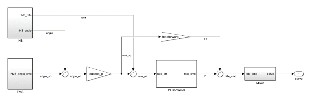 ,这个控制器主要实现飞机滚转角、俯仰角、偏航角速率的控制,对应着自稳功能的实现。自稳模式下的控制指令由FMS模块将遥控器通道的摇杆位置映射成滚转角、俯仰角、偏航角速率发出,Controller将接收到姿态角的期望值,同时接受到INS模块检测到的当前姿态角,将两者作差,得到姿态角误差输入,最终转化为副翼、升降、方向的三个舵偏角输出。首先滚转角、俯仰角误差值进入外环角度P控制转化为期望角速度,根据滚转角、俯仰角将计算出当下协调转弯的期望偏航角速度,同时偏航操纵杆映射的偏航角速率期望会与其相加。经过外环控制后,得到三个方向的滚转角速度,内环控制由期望值前馈控制和误差值pi控制组成,前馈能够提高系统的响应速度,积分控制器可以有效地消除稳态误差。经过前馈和pi控制得到归一化的飞机转动角速度,将得到的归一化指令通过混控器转化为PWM指令输出分配给末端的执行机构即电调和舵机。