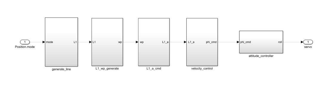 定点模式下,飞机将保持水平匀速直线飞行。相较于定高模式,定点模式会在定高的基础上保持当前航向,抵抗外界干扰(如侧风)对飞机飞行轨迹的偏离影响。具体实现为切换至定点模式时,FMS将根据当前的飞机朝向生成一条射线,以飞机为圆心,参数L1为半径作圆,圆与射线的交点生成为期望航点。FMS根据期望航点来生成L1的侧向期望加速度,将加速度指令发送给Controller,由Velocity Controller来解算出需要修正的期望滚转角。期望滚转角输入Attitude Controller,最终由Attitude Controller输出舵偏角。