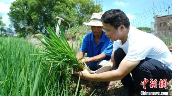 图为种粮大户熊模昌和农户在稻田进行查苗、查病工作。 贺登毅 摄