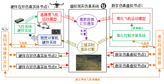 飞思集群仿真平台基于以上需求,提出了如下图所示虚实结合的仿真构架,将仿真节点分为两类:实体节点和虚拟节点。其中,实体节点具有较高的模型精度,且将飞控系统、机载视觉计算机、组网通信链路等硬件实体直接接入仿真闭环,形成半物理仿真系统,实现更高精度和可信度的模拟实验效果;而虚拟节点基于专家知识、物理模型、物理空间等多维数据,进行建模和分析,构建物理实体的高保真数字孪生模型,在保证基本仿真精度需求的情况下,采用了简化的运动和控制模型,可以实现大规模无人机集群节点的快速模拟。因此,实体飞机节点精度高,但是占用硬件和计算资源多,在整体集群仿真中少量部署;而虚拟飞机节点精度稍低,但是占用资源少成本低,可在集群仿真中大量部署。通过合理配置实体飞机节点和虚拟飞机节点的数量,可以实现在成本与精度的平衡,实现大规模集群仿真较好的算法验证效果,同时,结合人工智能技术,通过数据融合分析、虚实交互反馈和决策迭代优化等手段,实现物理实体空间与数字虚拟空间的交互共融和智能化操作,提供无人系统集群智能方向的数字孪生解决方案。