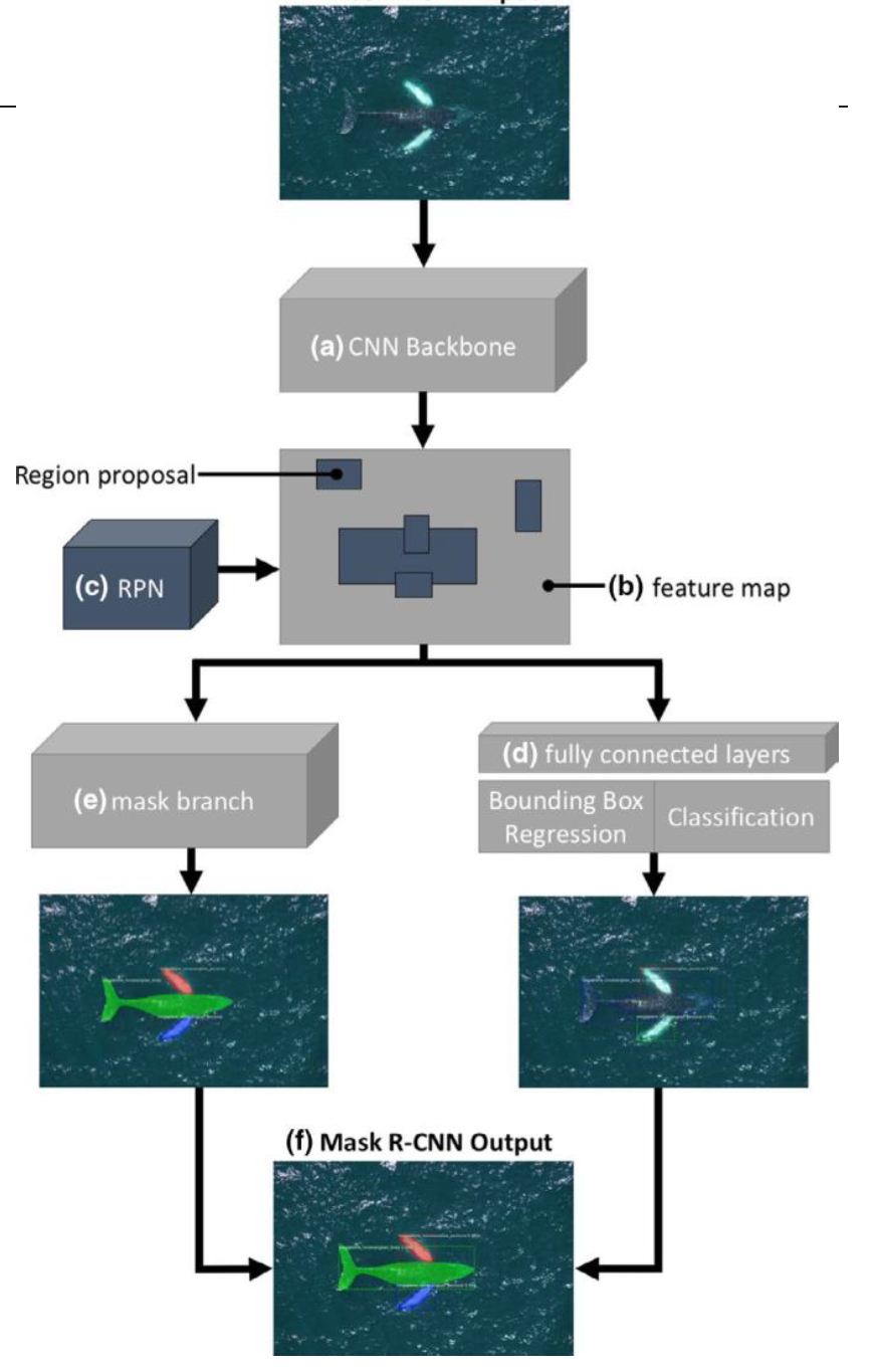 对于精确和自动化的摄影测量,每个图像中可能有多个动物,CNN必须成功完成实例分割——将图像中的每个像素映射到定类别并分离该类别的每个实例的任务。我们通过Mask R‐CNN摄取图像并输出每个感兴趣对象周围的边界框、每个对象(例如鲸鱼物种)的类别以及每个边界框内对象的完整像素掩码。