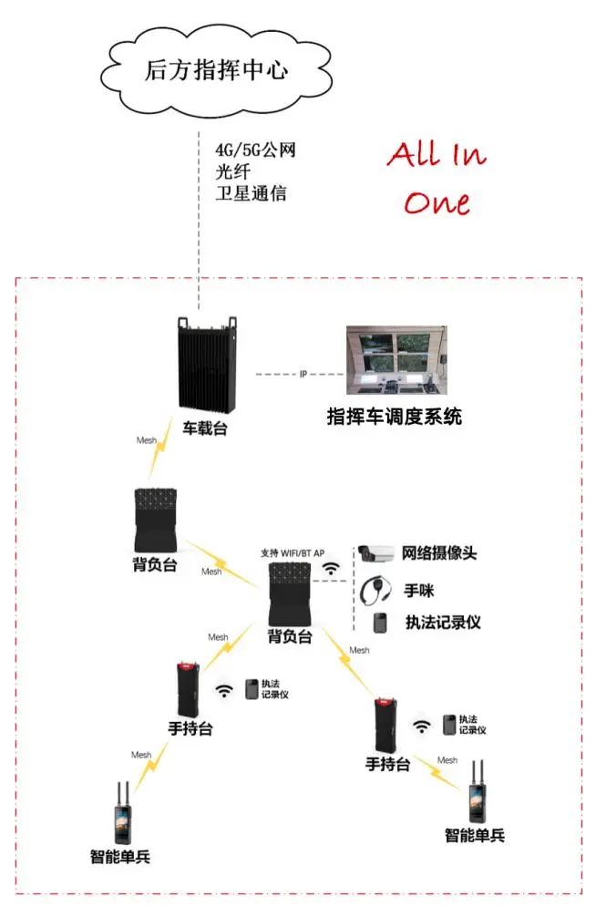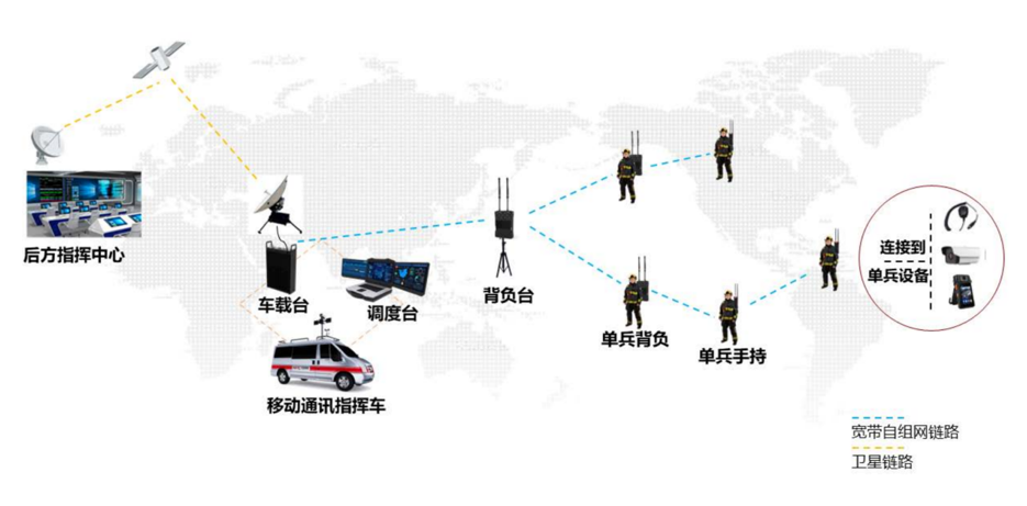 在实际作战中,只需将调度系统和车载台部署于移动指挥车中,由前线人员(前突单兵)穿戴好背负台或携带手持台前往目标地点,即可搭建现场指挥作战通讯网络。通过融合公网、光纤和卫通等方式,还可将现场情况实时回传到远方指挥中心。