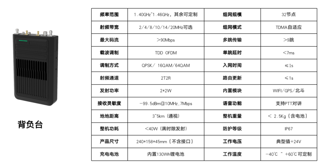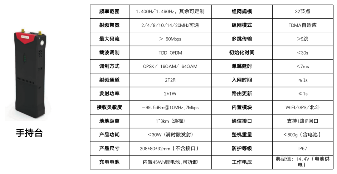 宽带多媒体自组网设备,同时支持语音和视频功能,可快速部署、拆装方便、替换简单,满足大型场馆活动的需求。有效规避公网信号不稳定、监控死角多等问题。