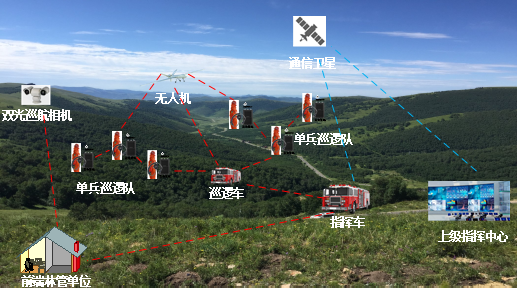 指挥车和巡逻车部署自组网车载节点,快速进入林区,便于信息采集、巡逻监控及前指,并为周边巡逻员提供无线网络支撑;同时,通过与卫星通信系统互联,将现场信息第一时间回传后端监控指挥中心。