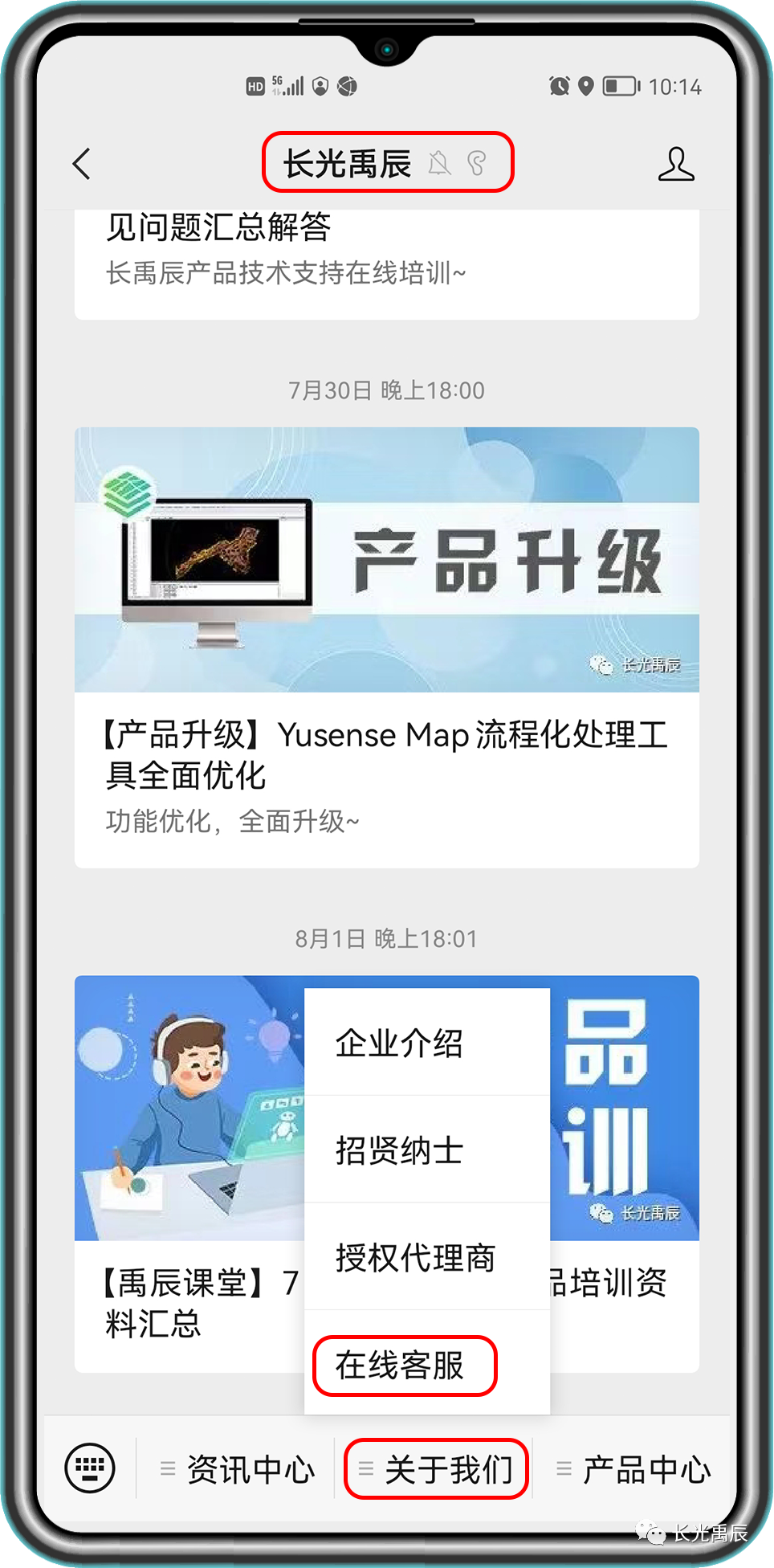 关注“长光禹辰”微信公众号,点击底部“关于我们”,点击“在线客服”,即可进入客服对话框。