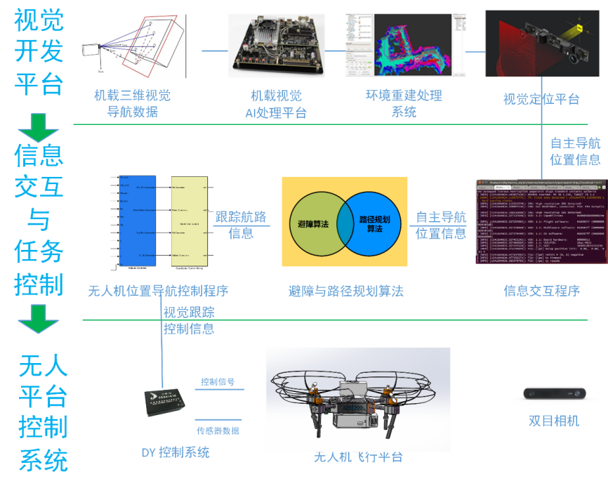 该平台主要由无人智能体运动平台、视觉导航传感器、惯性导航器件、机载计算机等部分组成,具体如下: