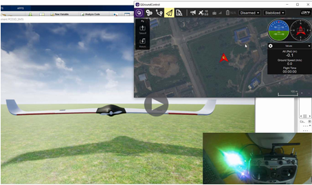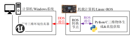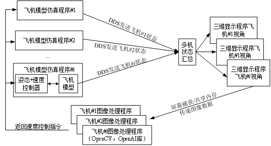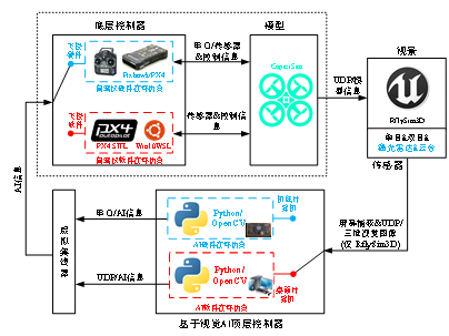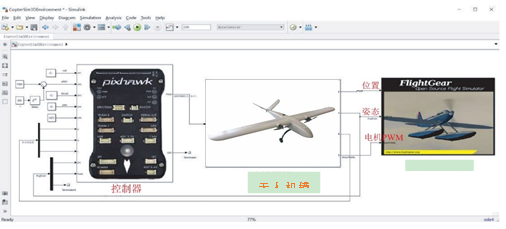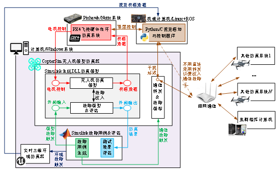 系统支持外部传感器接入,传感器数据分为两类:直连飞控的外部传感器(磁罗盘、差分GPS、光流测速等),另一类是直连机载计算机的视觉传感器(双目、Lidar、深度相机等)飞控传感器通过Simulink等程序直接生成传入Pixhawk飞控,视觉传感器通过三维环境引擎生成,随图像传入机载计算机。
