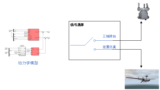 无人系统运动仿真模块接收无人系统飞控的舵机输出信号,采用六自由度动力学模型,解算出某型无人系统飞行运动状态,输出飞机的姿态、位置、速度等状态参数。信号选择模块根据用户的选择将无人系统的状态参数输出到转台或者视景仿真系统。如果输出到转台,转台在转台控制模块的作用下,完成的无人系统飞行姿态的联动和模拟;如果输出到视景仿真系统,则可以在虚拟的三维场景中显示无人系统的运动姿态和运动轨迹。信号选择模块的框图如下图所示: