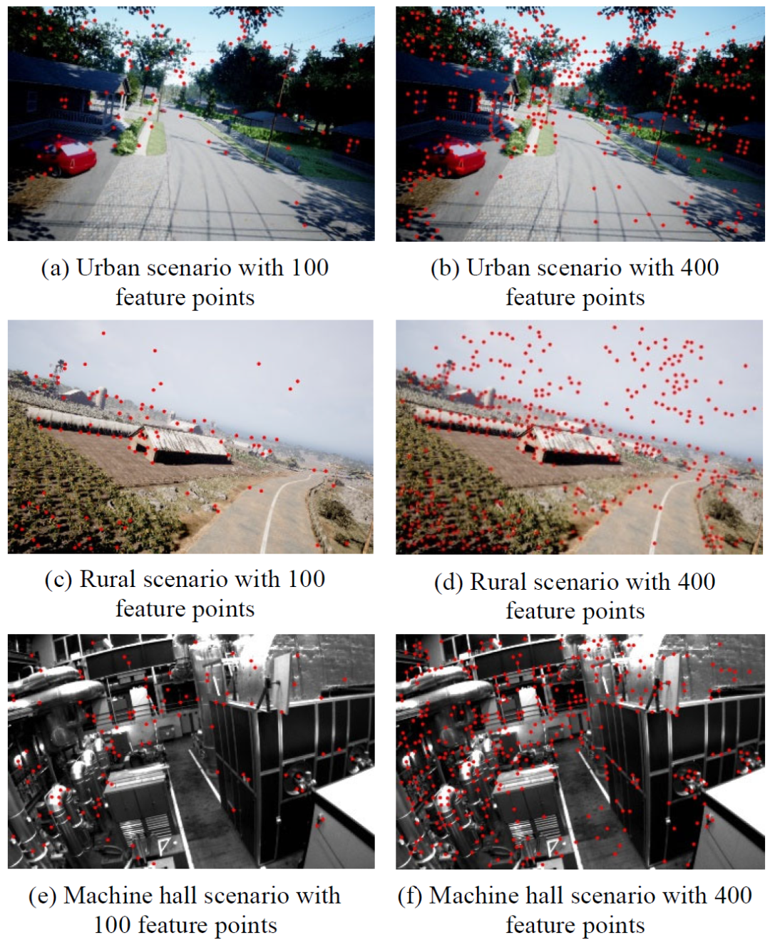图5显示了SuperPoint在三个场景中检测到的特征点,包括市区、农村农场和机房,具有两种不同的设置,100个和400个特征点。可以看出,边角、边缘、颜色变化等特征都被很好地检测到了。此外,检测到的特征分布在图像中,因此算法对某些对象的依赖性较小。