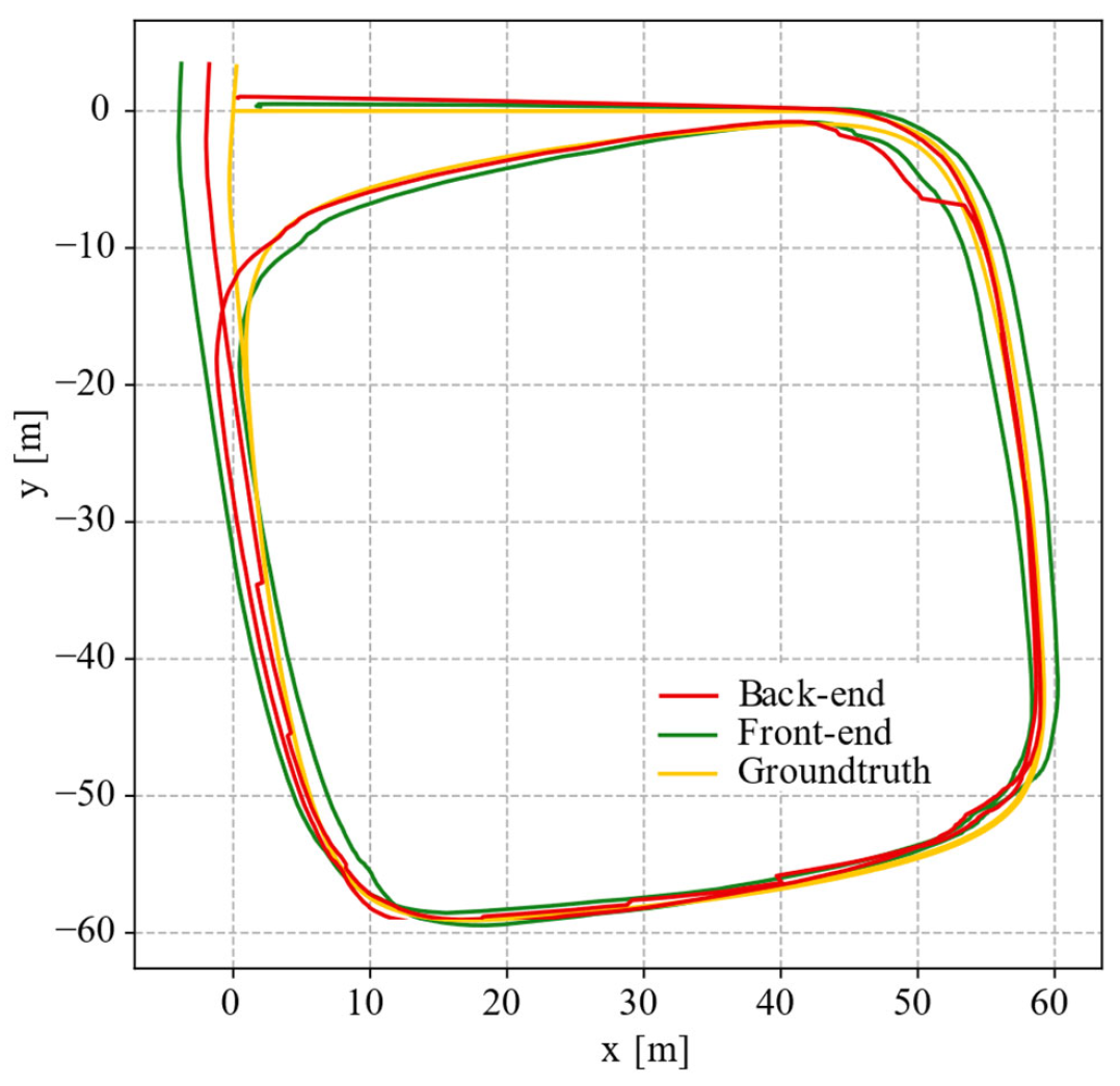 图8显示了LoopF数据集的SLAM结果,其中无人机在农村农场上方飞行两圈。可以看出,即使在近500m的长距离内,最终估计的轨迹(红线)也能很好地跟踪地面真实轨迹(黄线)。