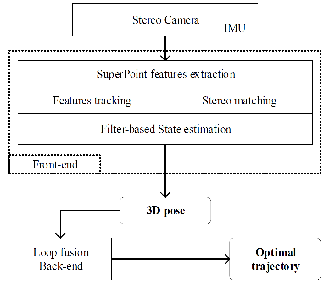 我们的SLAM系统如图1所示。该系统使用立体相机作为输入来提取环境的特征。该相机配有IMU,用于测量线加速度和角速度。然后通过前端和后端模块处理来自输入设备的数据。