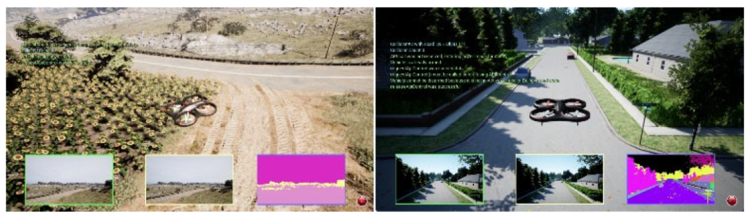 实验中使用真实数据和合成数据。真实数据包括三个最复杂的序列。合成数据包括两个场景,代表农村农场和城市区域,由我们从AirSim 开发的工具集生成,如图3所示。农村农场模拟了一个地形崎岖不平、植物种类繁多、农业设备齐全的农村环境。市区呈现出与汽车、树木和生活场所不同的平坦区域。