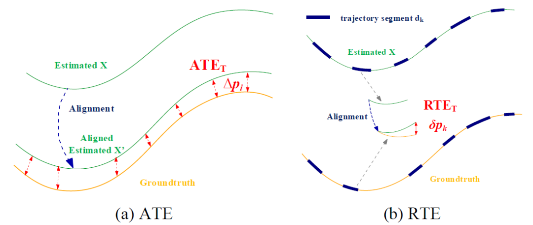 图4 评估指标的说明 (a) 绝对轨迹误差和 (b) 相对轨迹误差