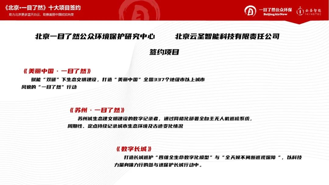 在我国“双碳”国家战略加持下,“十四五”时期,我国生态文明建设进入了以降碳为重点战略方向的关键时期,本次签约围绕强化“双碳”意识和目标、积极推动首都高质量发展、建设“美丽中国+健康中国”、打造全球数字经济标杆城市、为北京贡献更多蓝天、保护长城、乡村振兴、生态文明等国家战略和发展理念等内容开展,云圣智能携手一目了然公众环保带来了337城《美丽中国·一目了然》、《苏州·一目了然》、《数字长城》项目。