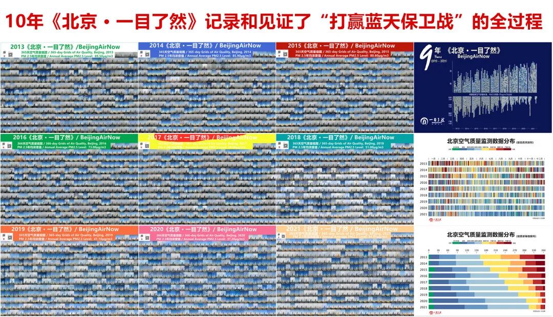 十年来,北京污染防治力度空前、生态环境实现了历史性变化的十年,2021年PM2.5年均浓度降至33微克/立方米,比2013年下降63.1%,被联合国环境规划署誉为“北京奇迹”。邹毅先生自2013年1月通过拍照的方式记录了北京这十年的大气污染防治取得的巨大成就。十年如一日用3652张照片拼出了极其珍贵的北京打赢蓝天保卫战的“视觉日记”,并把这种同一时间、同一地点、同一建筑物的拍照命名为《北京·一目了然》。