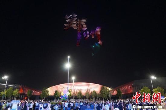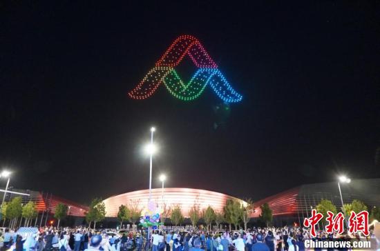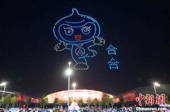 无人机编队表演呈现2022“双创周”吉祥物合合形象。