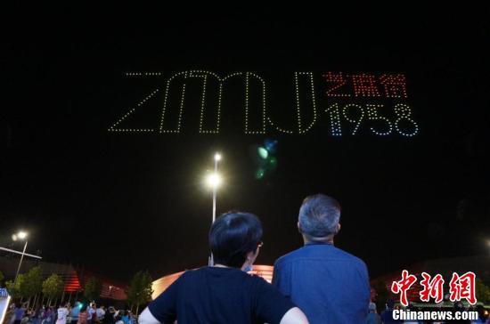 9月15日晚,河南郑州,市民观看无人机编队表演。2022年全国大众创业万众创新活动周于当日开幕。当晚500架无人机在郑州市奥体中心广场进行编队表演,依次呈现“双创周”标识、主题、吉祥物等符号。