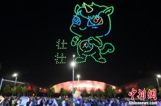 无人机编队表演呈现2022“双创周”吉祥物壮壮形象。