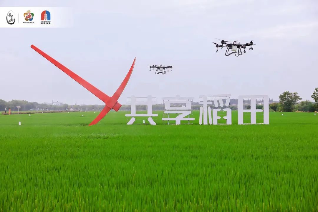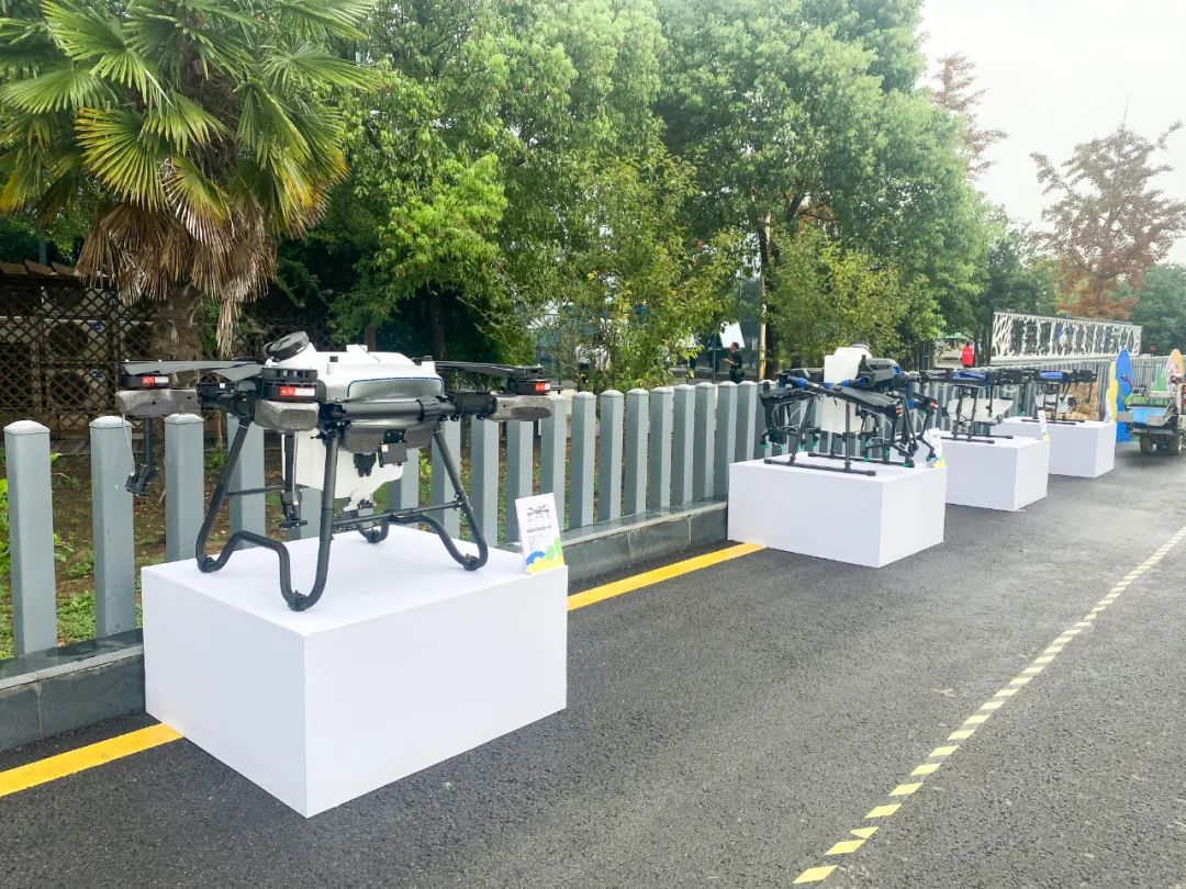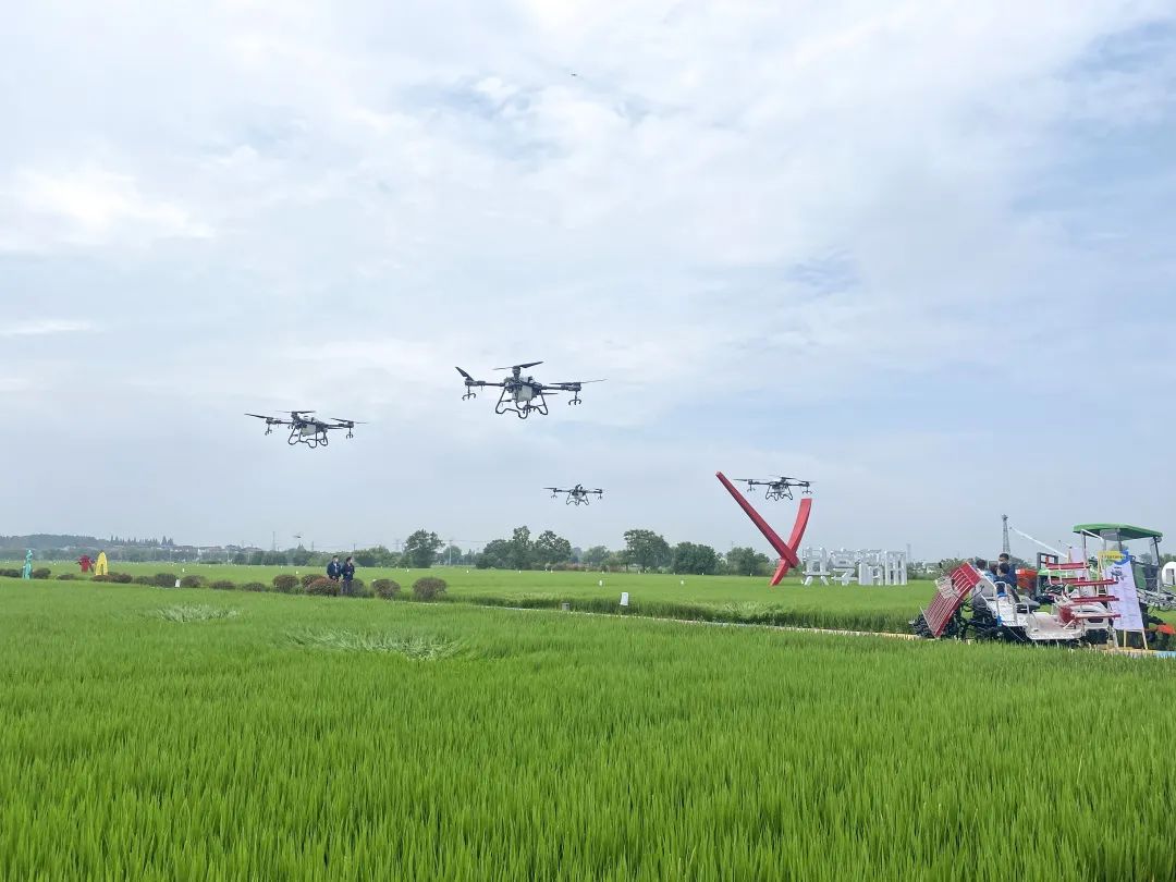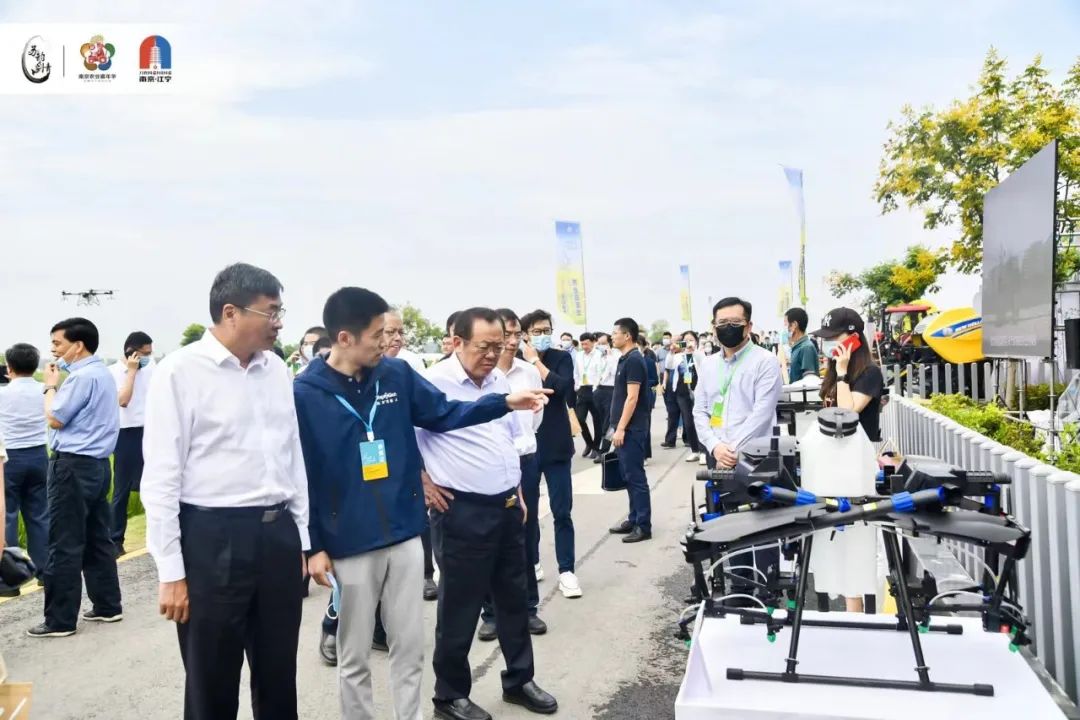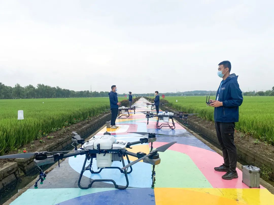 在领导嘉宾参观的过程中,四架拓攻丰鹏300农用无人机在湖熟这片高标准水稻示范田上腾空而起。随着飞手轻松的操控,飞机开启喷洒模式进行演示。这款丰鹏300不仅可以用于水稻打药,还可以用于水稻的播种、追肥,同时也可以应用在小麦、玉米、棉花、果树等其他农作物作业,一个作业季往往能作业万亩以上。优美的稻田景观和先进的无人机作业技术给各位领导和嘉宾留下了深刻印象。