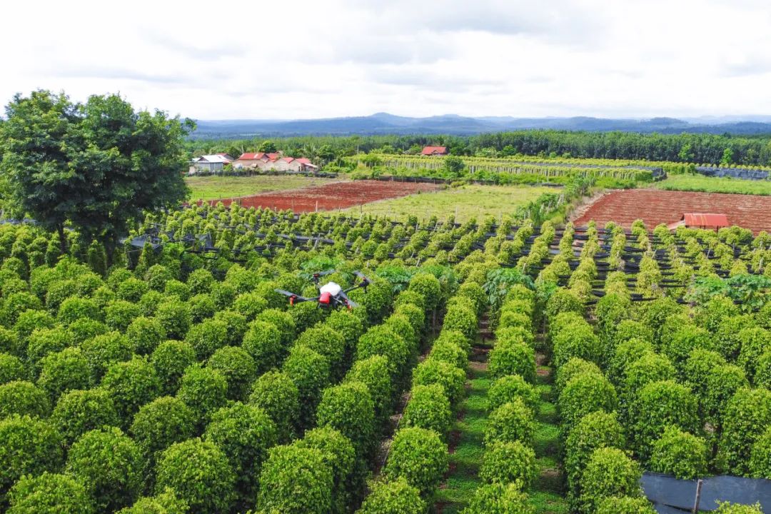 极飞农业无人机在柬埔寨蒙多基里省一处胡椒园开展空中植保作业。