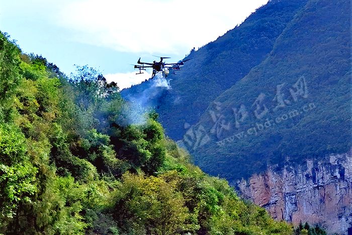 9月27日,在巴东县水布垭镇清江南岸国有巴山林场,县林业局正在实施无人机“飞防”作业,在高处喷洒甲维氯氰冷烟。
