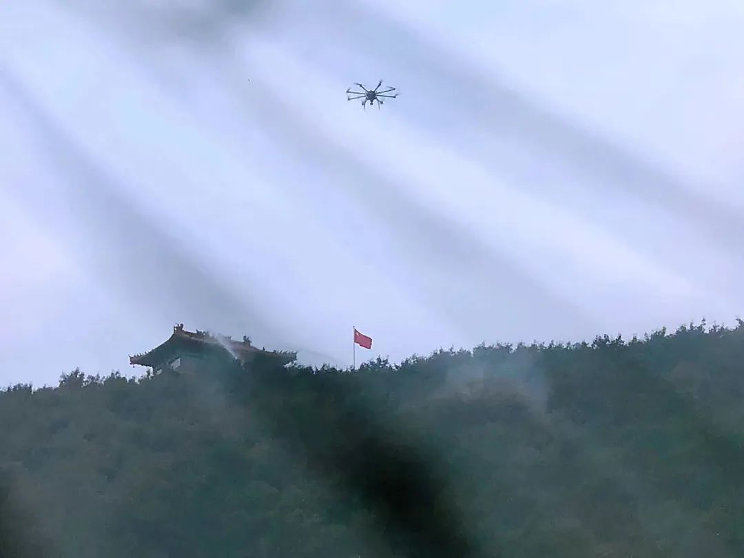 弥漫着烟雾的火焰上空,战狼X120C工业级无人机正在距离两公里外的高空进行喊话:“各村民请注意,后山发生森林火灾,请立即撤离!”