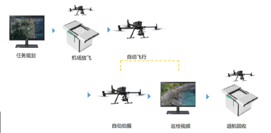 全自动化无人机巡检系统可灵活部署在海岸垃圾巡检作业区域范围内,作业人员设置好巡线路径,无人机系统即可完成无人机自动起降、图像采集、更换电池等作业,让无人机实现彻底的“无人化”作业。