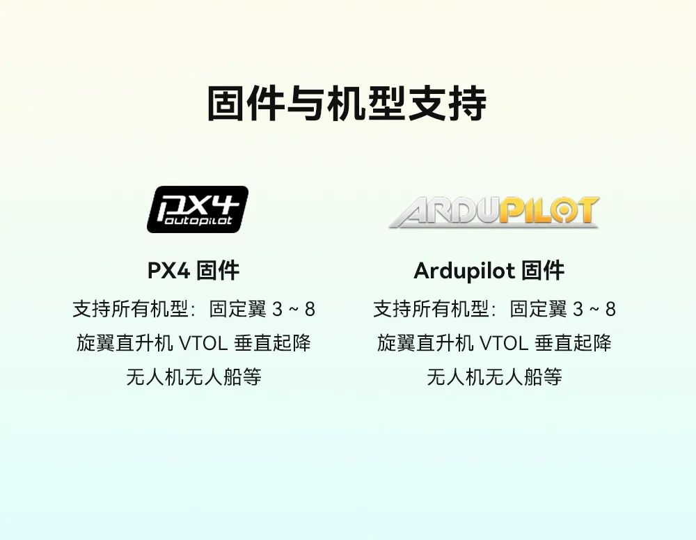 PX4及Ardupilot固件支持所有机型:固定翼3~8旋翼直升机VTOL垂直起降无人机无人船等。
