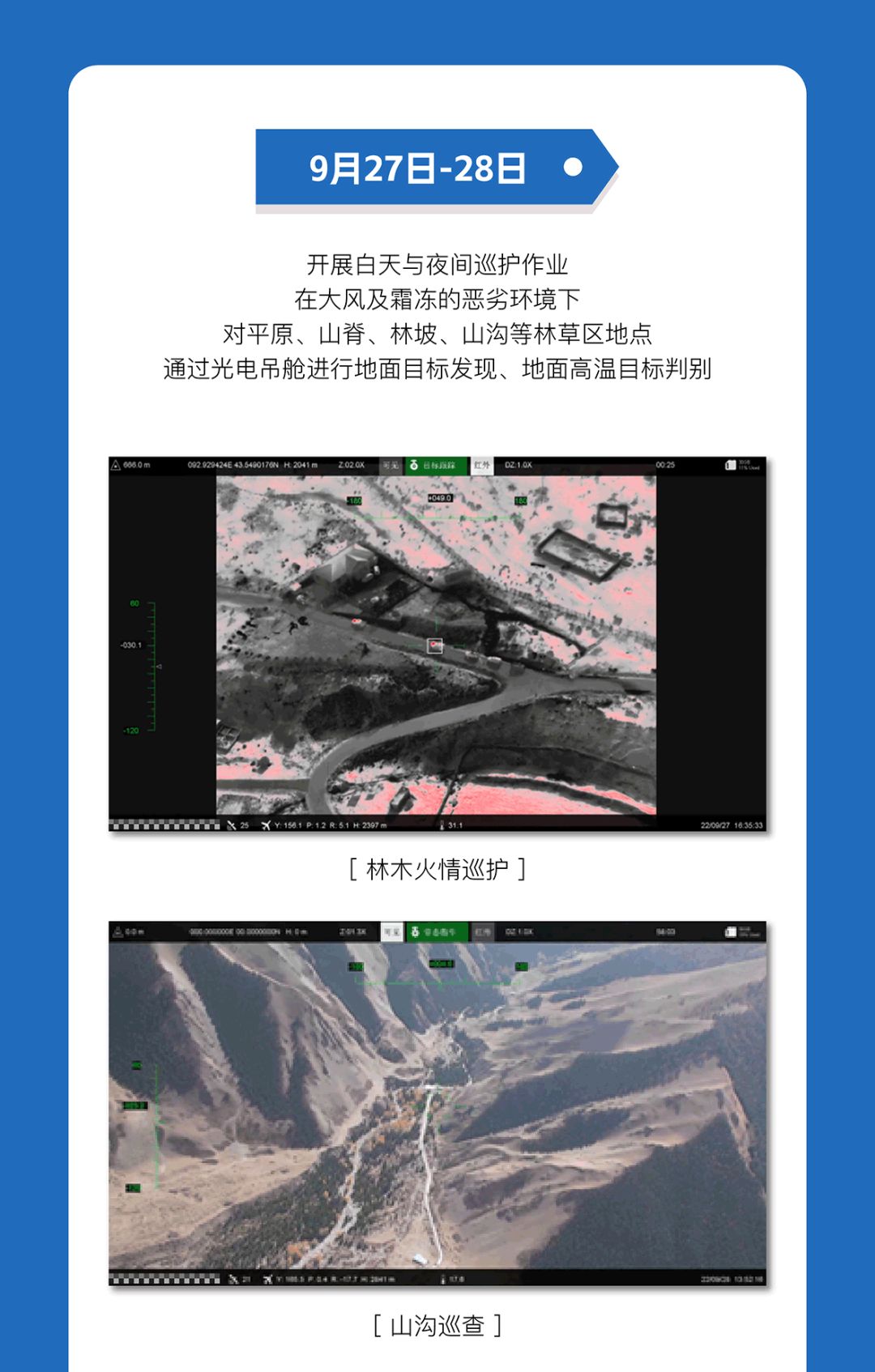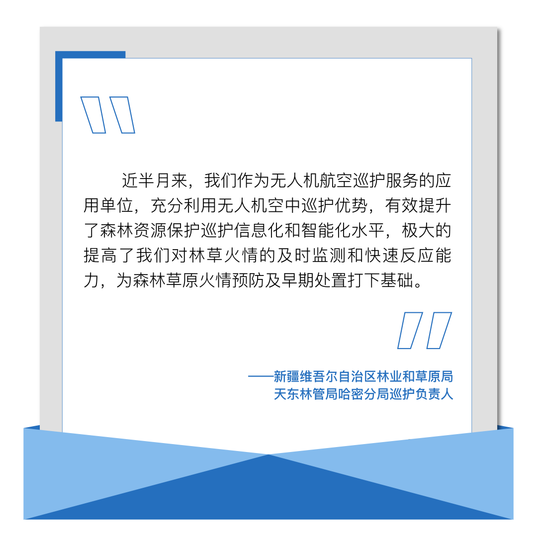 结合国有天然林管理实际,加强对偏远林区、地形复杂、人员难以到达的“三无两有”区域进行长时间、大面积、定点空中巡护,实现对森林草原的高效、全面监控。