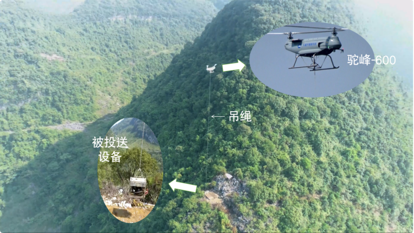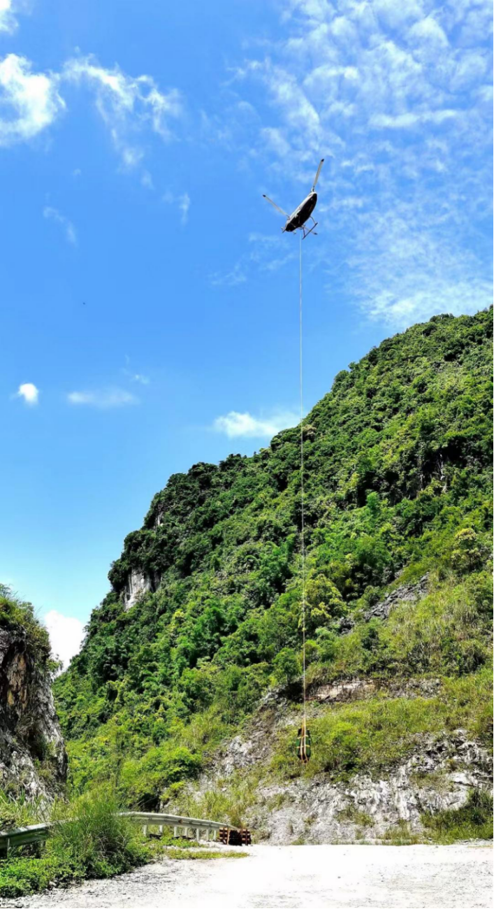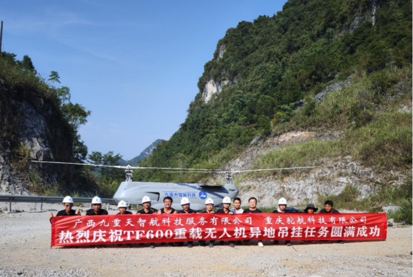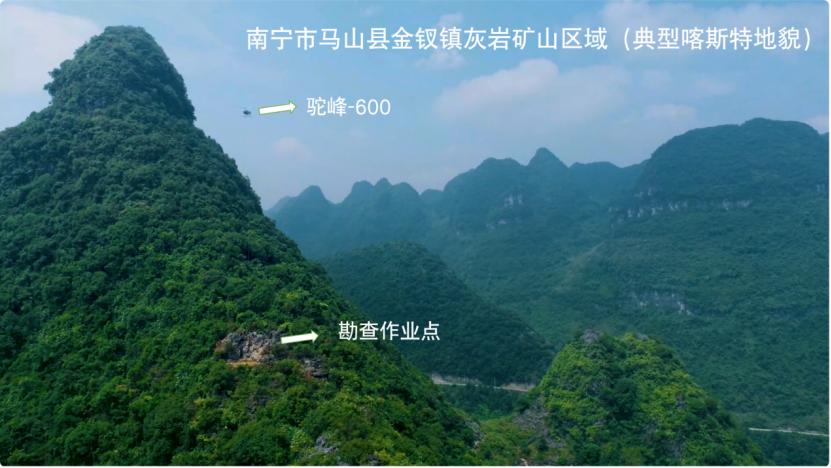 “所有设备均吊运至施工点,任务圆满成功!”日前,在具有典型喀斯特地貌的广西壮族自治区南宁市马山县金钗镇某灰岩矿山区域,重庆驼航科技有限公司新型号“驼峰”600重载无人机圆满完成全套勘查设备吊挂运投任务,实现地勘领域客户交付验收。这是“驼峰”600的首单交付,也是“驼峰”系列重载无人机首次交付地勘领域客户,更是国内首例重载无人直升机在绿色矿山勘查中的成功应用。