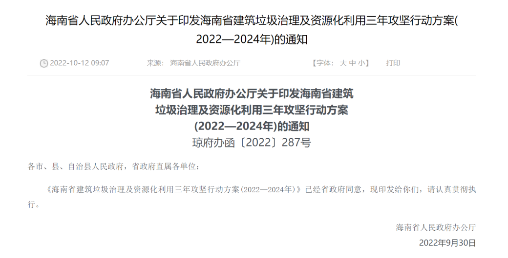 近日,海南省政府办公厅印发《海南省建筑垃圾治理及资源化利用三年攻坚行动方案(2022-2024年)》。