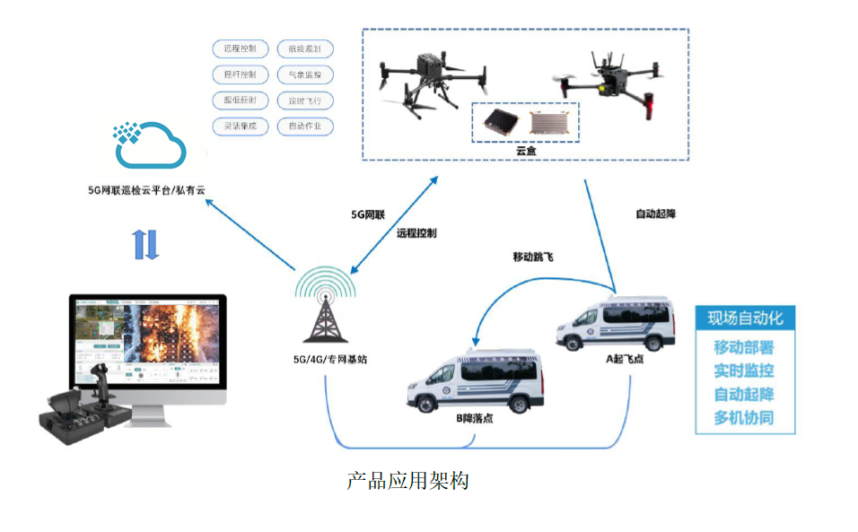 5G云盒助力无人机,可实现无人机自动起飞、精准降落、自动飞行规划、自动巡检巡逻、精准定位与跟踪拍摄等自主作业能力。