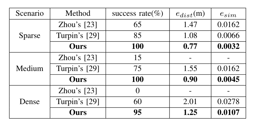 相比于其他方法,本算法的优化方法在位置误差和编队相似性误差上取得了良好的性能。因其提出的编队相似度量方法在缩放和旋转不变性为生成轨迹提供了很高的灵活性,即使在密集的环境中,也有很高的成功率去规划生成无碰撞编队轨迹。