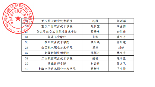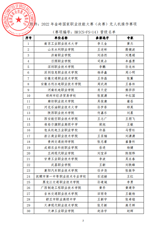 2022年金砖国家职业技能大赛(决赛)“无人机操作”赛项即将展开线下比赛,全国26个省份(自治区和直辖市),40所高职院校在选拔赛中脱颖而出,各地参赛选手即将奔赴福建省厦门市进行最后的决赛,下图是由金砖国家职业技能大赛组委会公布的晋级名单: