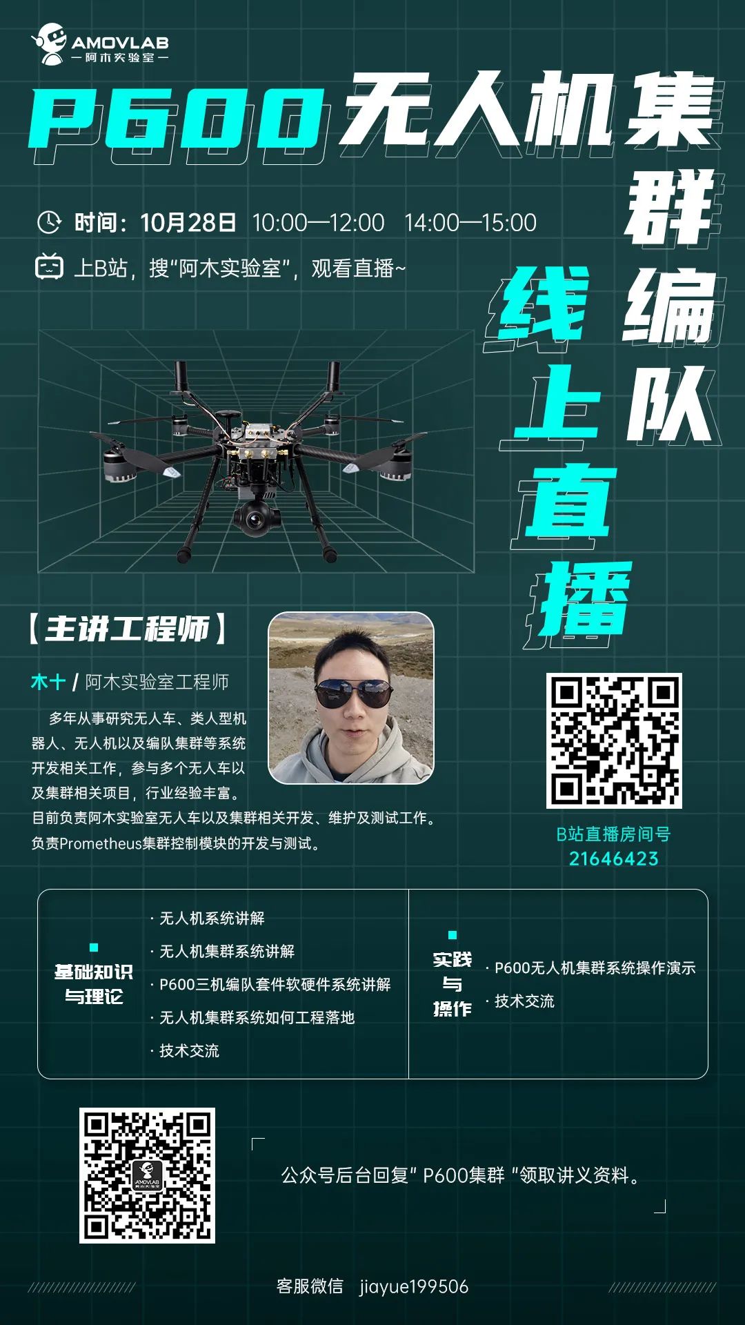 本次直播由阿木实验室官方工程师-木十,为大家直播分享P600无人机集群编队,内容涵盖无人机集群系统、无人机集群系统组成、相关软硬件模块介绍,以及无人机集群飞行操作过程。