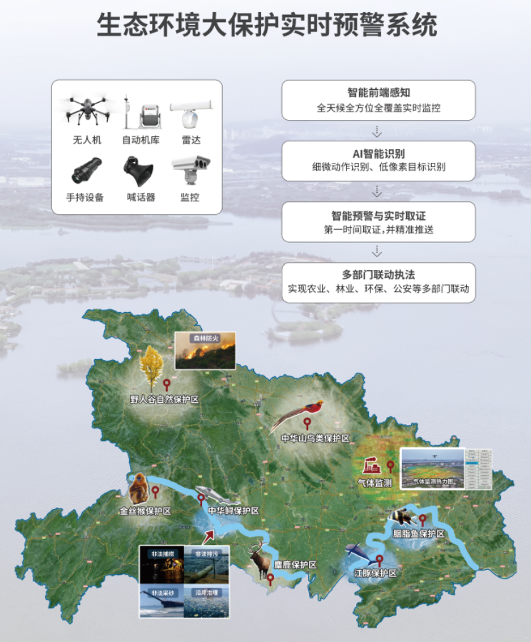 目前,普宙科技凭借优质的产品和方案,与湖北多地业务部门携手打造出全时、全域、全线、空地一体、水陆联动的禁捕执法监管新模式。2021年以来,助力武汉市成功部署智能前端及实时预警平台,完成“1+6+4”全面布控,实现了农业、公安、水务、市监局、环保等多部门联动执法;同时大力配合荆州市农业禁捕办信息化转型需求,积极参与“天网工程”项目建设,逐步实现市县设备、系统、平台无缝对接,打造了通信与指挥一体化的信息化系统平台。科技赋能长江禁捕常态化、智能化,为湖北省长江大保护事业的稳健开局提供了坚实的技术支撑。