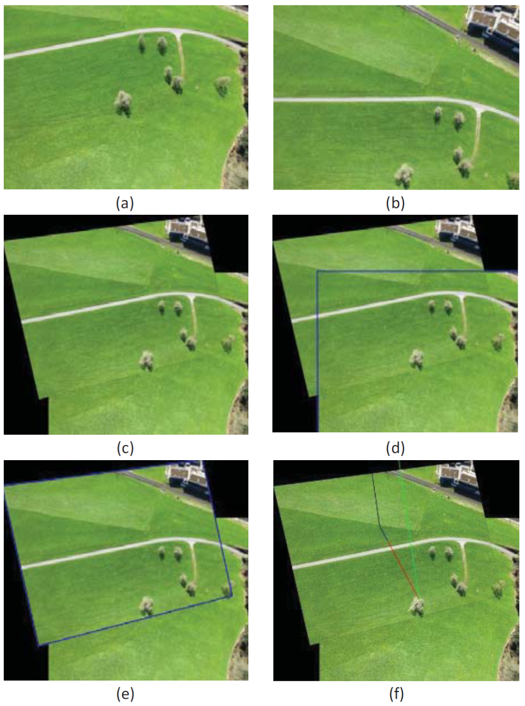 为了验证所提出的方法,已经进行了几种利用数据集的实现,这些数据集由senseFly提供,并由携带senseFly S.O.D.A.摄像头的eBee Plus无人机收集。与视频一起附上,提供了每个捕获帧的元数据,其中包括位置(纬度,经度和高度)。由于尺寸限制,图2中显示了使用所建议方法应用SLAM的一个示例。、 和分别如图2(a)、图2(b)和图2(c)所示。图2(d)和图2(e)分别表示和在中的同质性。在图2(f)中,方位角显示在代表原始航向的绿线和代表当前航向的红线之间。请注意,确定坐标所需的总执行时间小于飞行持续时间。
