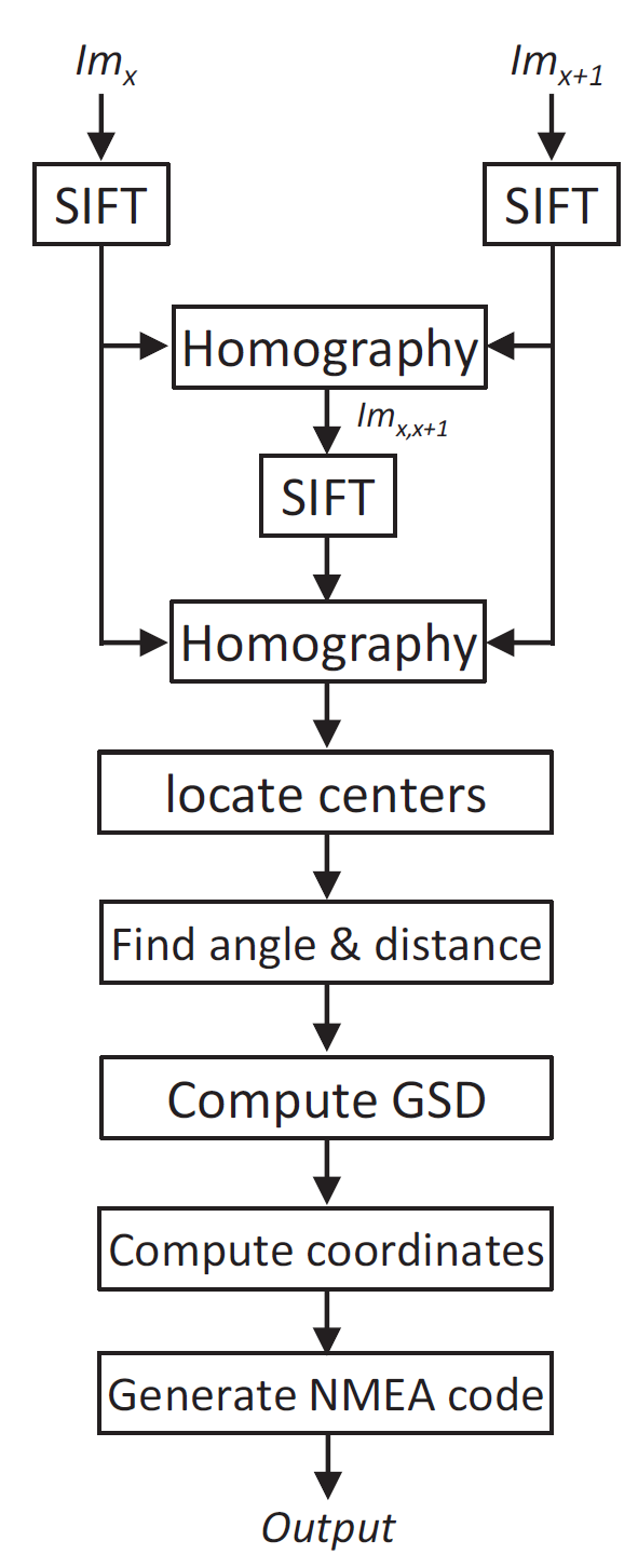 无人机应该从具有已知坐标的初始位置开始导航。该方法使用图像拼接来确定两个连续捕获的图像之间的角度和距离。受益于无人机的高度,该高度由嵌入在自动驾驶仪中的气压计传感器确定,实际距离是使用地面采样距离(GSD)方法确定的。对于每个新捕获的图像,所有这些步骤都会不断重复。每当自动驾驶仪检测到GNSS接收器发生故障时,就会计算当前位置的坐标,并使用美国国家海洋电子协会(NMEA)格式将当前位置的坐标馈送到自动驾驶仪,该格式被大多数可用的GNSS接收器采用。