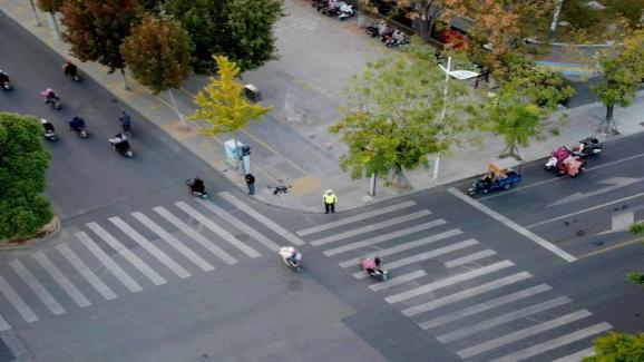 执勤辅警利用无人机对相文路周边的车流、人流进行空中巡逻,通过无人机拍摄,道路清晰的画面在操作屏幕上一览无遗,并及时对巡逻中发现的骑电动车不佩戴安全头盔、逆向行驶、非机动车在机动车道混行、越过停止线停车等交通违法行为进行“隔空喊话”劝导制止,提示交通参与者安全文明出行。